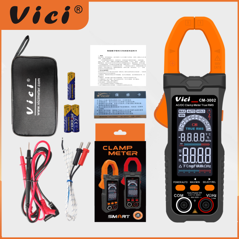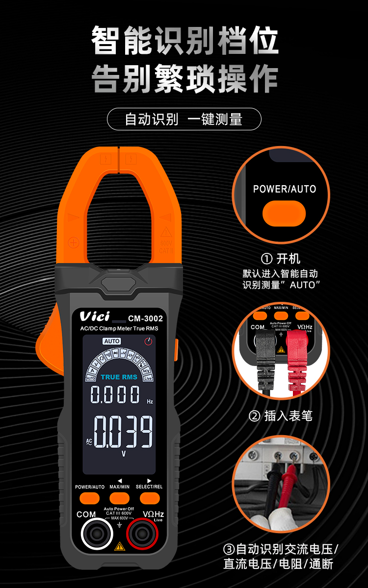 800A交直流大彩屏智能鉗形表CM-3002:自動識別一鍵測量功能,鉗頭手電筒照明/背光顯示,真有效值、NCV功能、占空比、相對值、數據保持、低電壓提醒、自動關機。