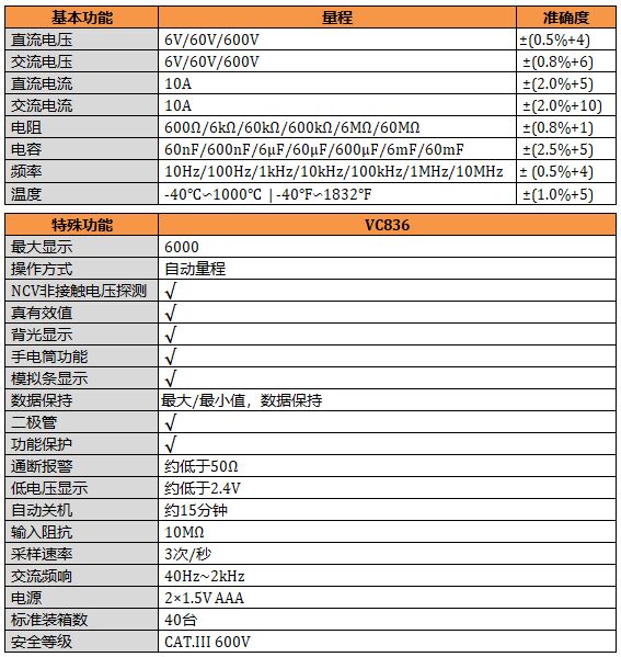 VC836 智能測量,真有效值測量,模擬條顯示,NCV測量,讀數保持,背光顯示,照明功能。