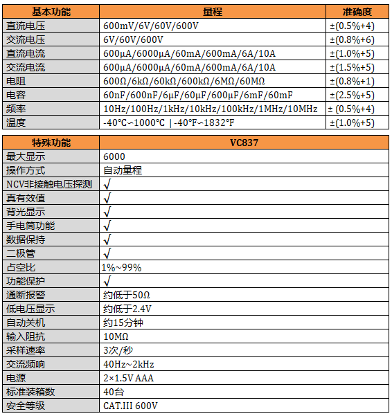 VC837 6000碼顯示,真有效值測量,NCV測量,讀數保持,背光顯示,照明功能。
