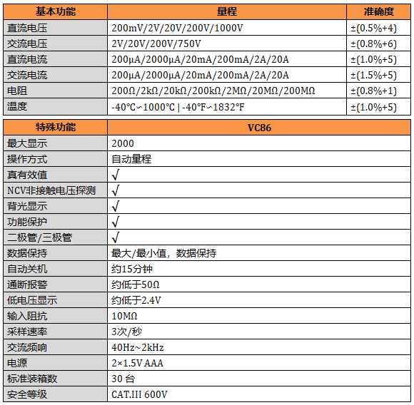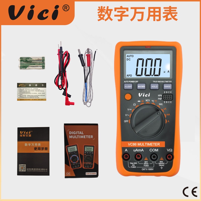 VC86可測量直流電壓、交流電壓、直流電流、交流電流、電阻、
