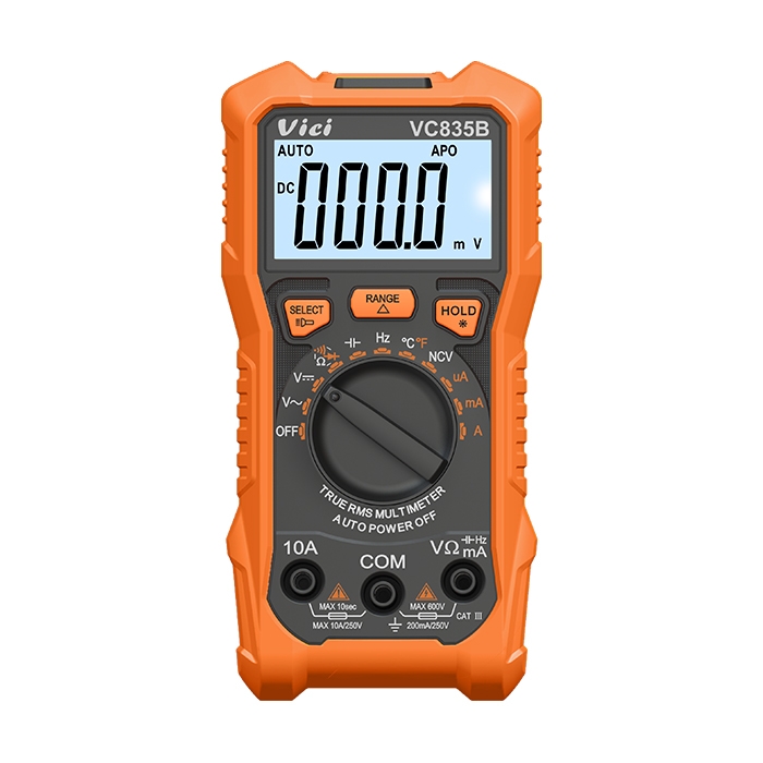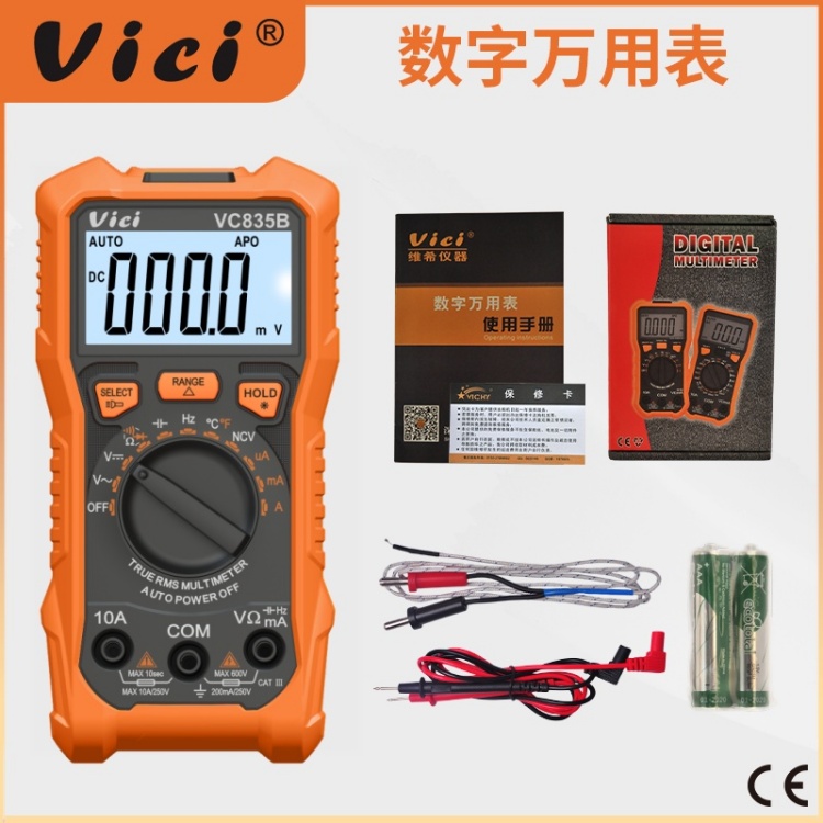 VC835B可用來測量直流電壓、交流電壓、直流電流、交流電流、電阻、電容、頻率、非接觸電壓探測、占空比、溫度、二極管及通斷測試;同時還設(shè)計有單位符號顯示和照明功能,數(shù)據(jù)保持、自動量程轉(zhuǎn)換、自動斷電及報警功能。
