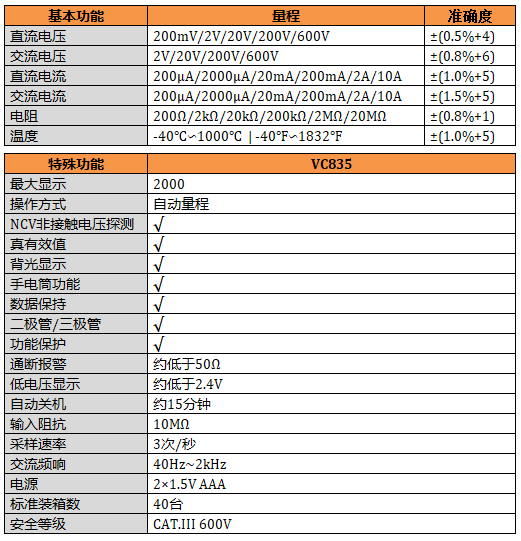 VC835 真有效值測量,NCV測量,讀數(shù)保持,背光顯示,照明功能。