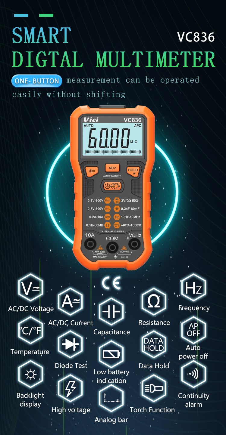 VC836 Intelligent True RMS, NCV tests, Analog bar display, Data hold, Backlight, Torch lighting function.
