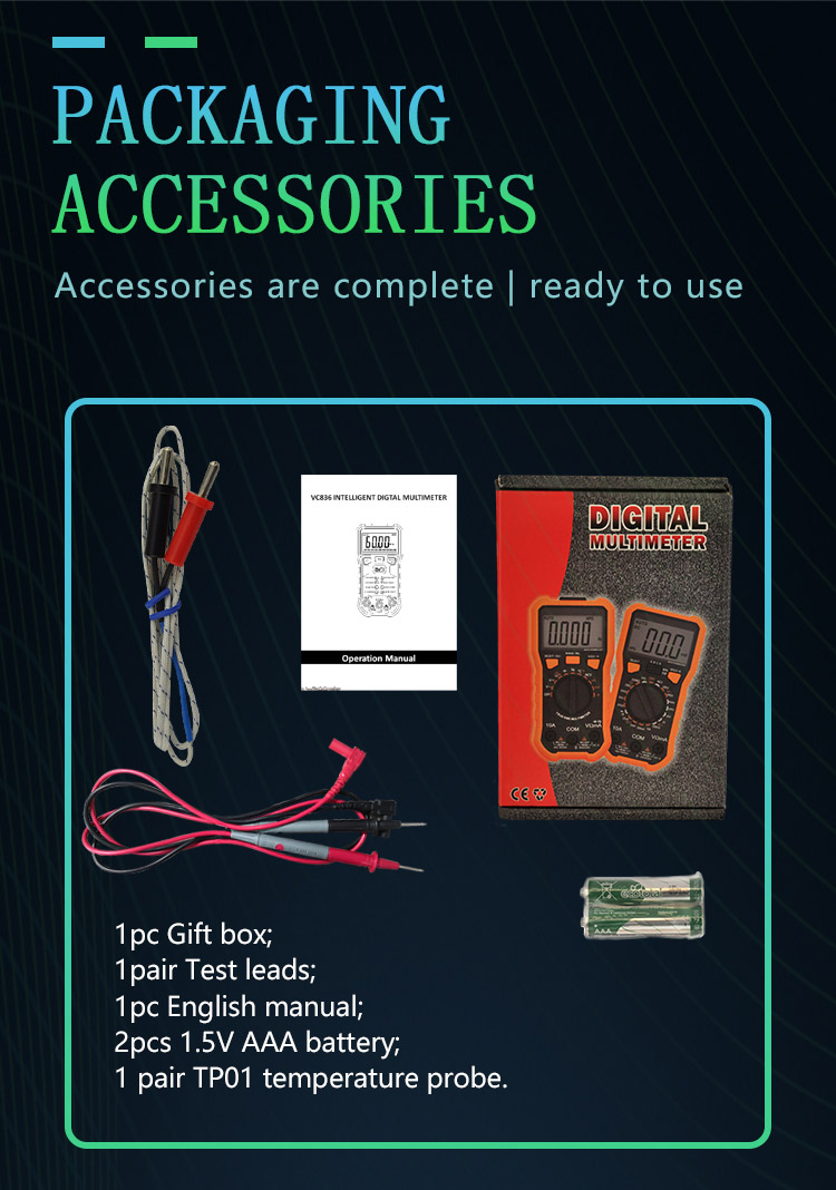 VC836 multimeter, automatically tests DC voltage, AC voltage, AC current, AC current, Resistance, Capacitance, Frequency, Non-contact voltage (NCV) detecting, Duty-cycle, Temperature, Diode and Continuity; Designed with unit symbol, torch lighting, data hold, analog bar display, backlight display, auto ranging switch, auto power and alarm functions.