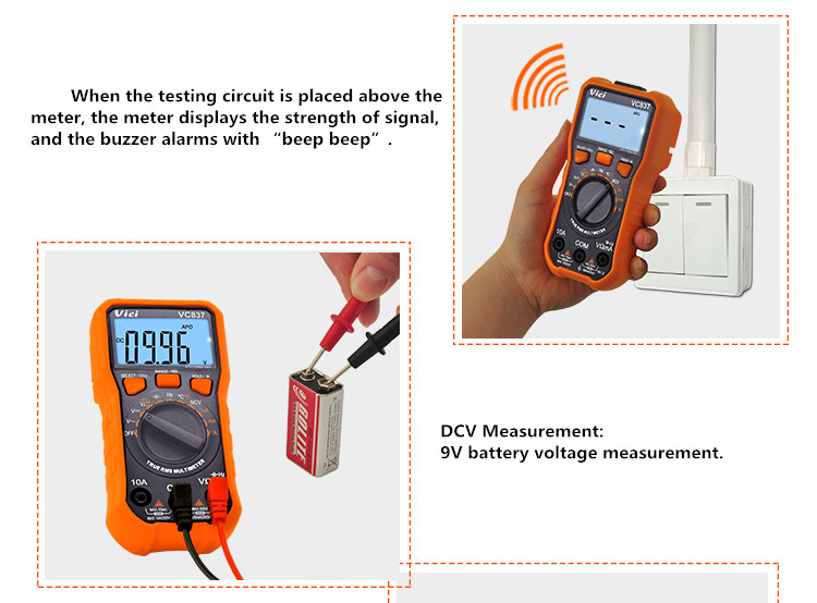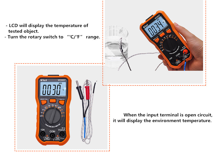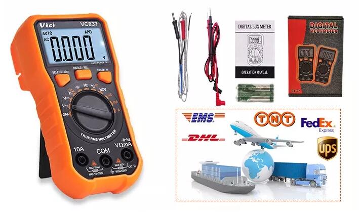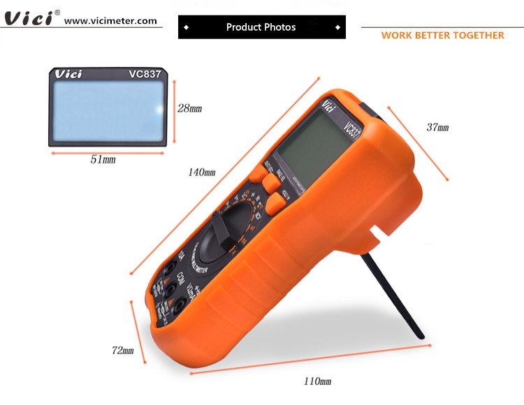 VC837 multimeter, available to  DC voltage, AC voltage, DC current, AC current, Resistance, Capacitance, Frequency, Non-contact voltage (NCV) detecting, Duty-cycle, Temperature, Diode and Continuity tests; Designed with unit symbol, Torch lighting, Data hold, Auto ranging switch, Auto power off and alarm functions.