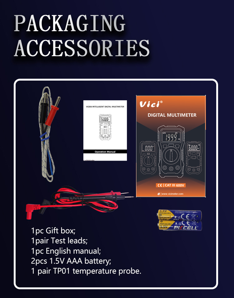 VC837A multimeter, available to DC voltage, AC voltage, DC current, AC current, Resistance, Capacitance, Frequency, Non-contact voltage detecting, Duty-cycle, Temperature, Diode and Continuity tests; Designed with unit symbol, backlight display, analog bar display, torch lighting, data hold, auto ranging switch, auto power off and alarm functions.