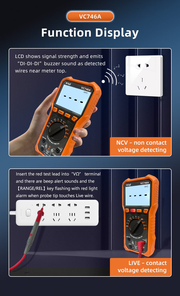 VC746A digital multimeter, available to measure AC/DC voltage, AC/DC current, resistance, capacitance, frequency, contact and non-contact voltage detection, duty cycle, temperature, diodes, and continuity testing. It also features true root mean square (RMS), NCV+Live voltage detection, high-voltage symbol indication, frequency/duty cycle measurement, backlight/flashlight lighting, data hold, low-voltage display, and auto power-off functions.