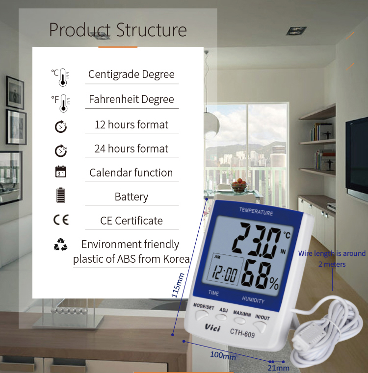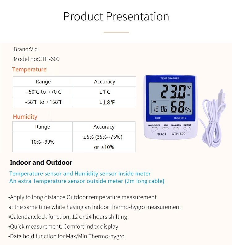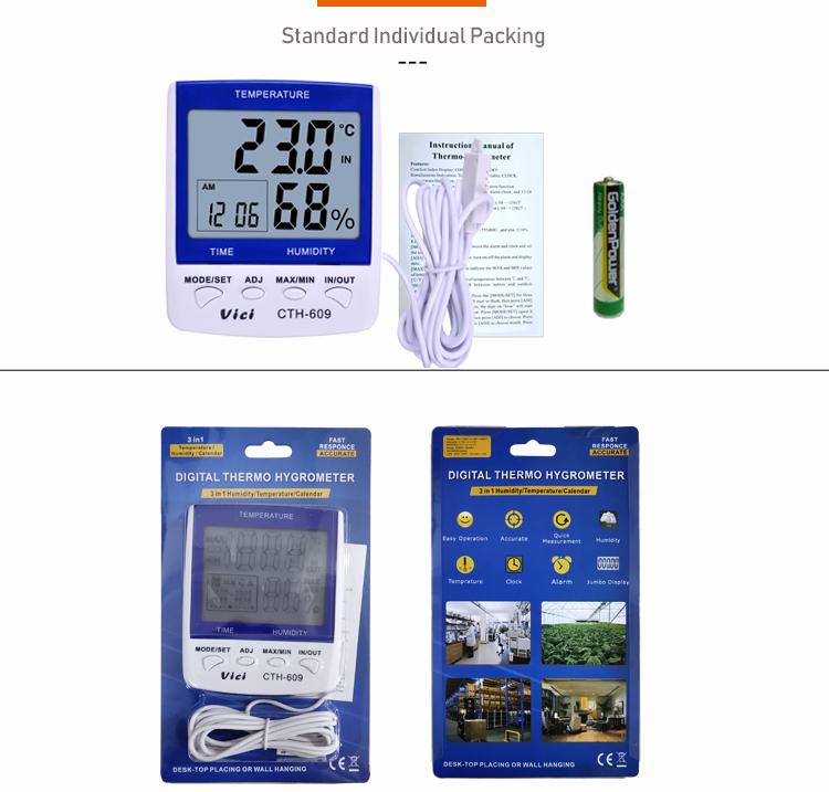 CTH-609 dual temperature testing thermo-hygrometer can be placed or hung in living rooms, bedrooms, offices, warehouses, specially designed for monitoring outdoor temperatures in cold winters and monitoring temperatures in refrigerated warehouses. Monitor the indoor environment temperature and humidity and outdoor temperature at any time, monitor the temperature and humidity outside the frozen warehouse and the internal temperature, ensure a comfortable space and sleeping conditions, and ensure that the stored materials will not deteriorate.
