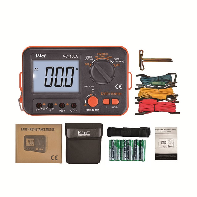 VC4105A earth tester, adopts three-wire measurement to effectively test the true grounding resistance of the grounding pile and ensure the grounding safety of various facilities. It can be reliable tested for the grounding of the voltage equalization ring of the lightning protection device of the building and curtain wall, the grounding of the pole erection and the grounding of various equipment.