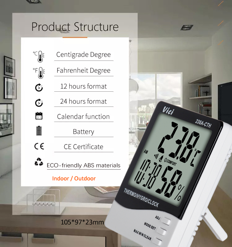 230A-CTH thermo-hygrometer (outside temperature and humidity sensor) can be placed or hung in living rooms, horizontal, offices, warehouses, specially designed for monitoring outdoor temperature and humidity in cold winters and monitoring temperature and humidity in refrigerated warehouses. Monitor the ambient temperature and humidity at any time to ensure a comfortable space and sleeping conditions, and ensure that the stored materials will not deteriorate.