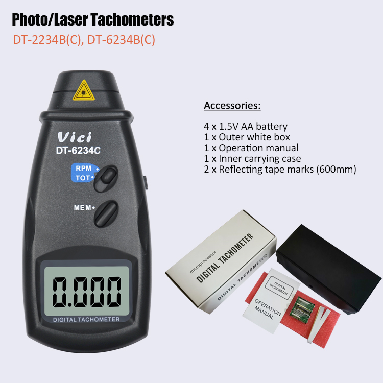 DT-6234C laser digital tachometer is used for touchless speed testing of rotors such as various engines, motors, speed control devices, etc. It is used in the debugging of various devices such as aircraft, ships, emmobiles, automobiles, model aircraft, and toys.
