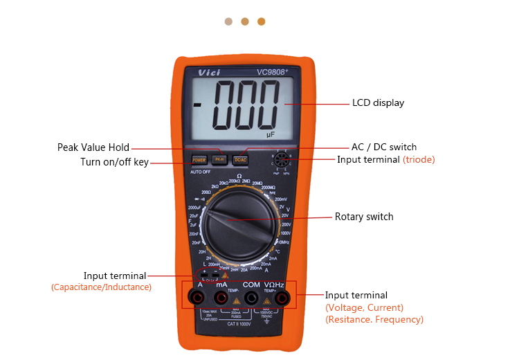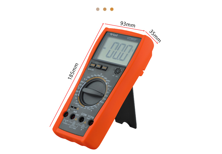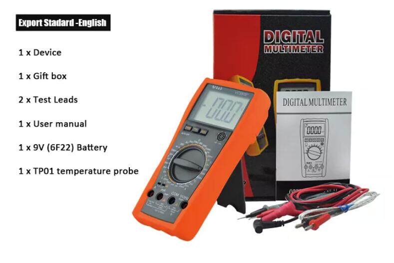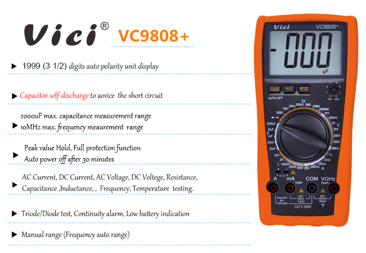 VC9808+ multimeter, available to DC voltage, AC voltage, DC current, AC current, Resistance, Capacitance, Inductance, Frequency, Temperature, hFE, Diode and Continuity tests; Designed with unit symbol, peak value hold, auto power off and protect function for error operation.