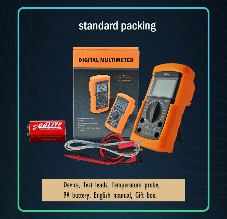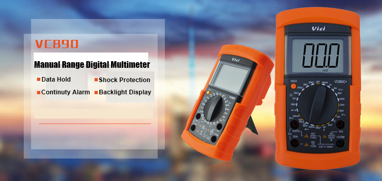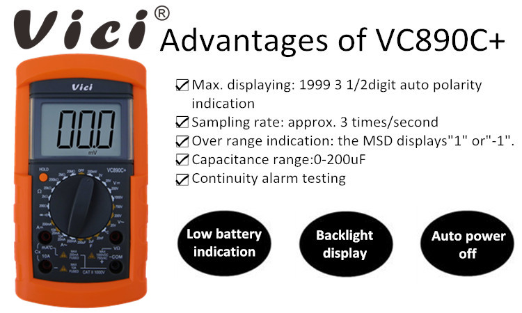 VC890C+ multimeter, DC voltage, AC voltage, DC current, AC current, Resistance, Capacitance, Temperature, Diode and Contunity tests; Designed with unit symbol, data hold, Auto power off and alarm functions.
