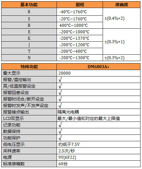 DM6803A+ 雙顯示智能報警輸出控制,支持八種分度的熱電偶,可設定報警回差,數據記錄功能。