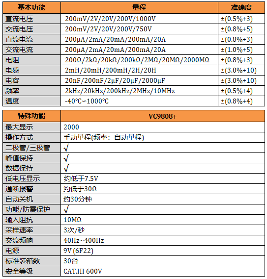 儀表可測量直流電壓、交流電壓、直流電流、交流電流、電阻、電容、電感、頻率、溫度、三極管、二極管及通斷測試;同時還設計有單位符號、峰值保持、自動斷電及誤操作保護功能。