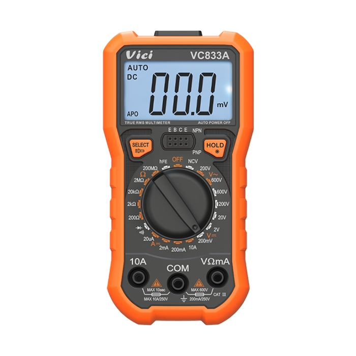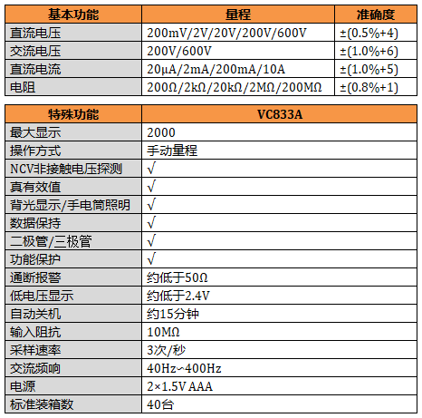 VC833A 手動量程,真有效值測量,NCV測量,讀數保持,背光顯示,照明功能。