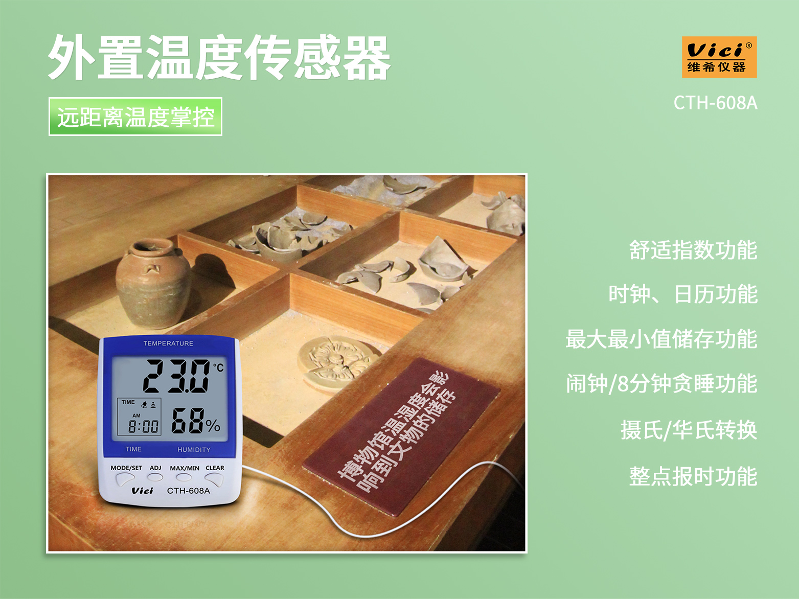 CTH-608A 數字溫濕度表,遠距離測量,時鐘、日期功能,最大值、最小值溫濕度儲存功能。